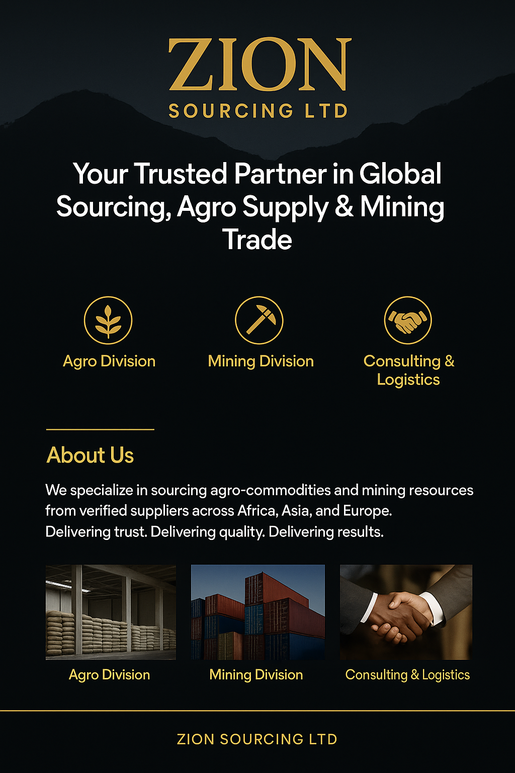Zion Sourcing Ltd is your trusted partner in global trade, connecting buyers worldwide with verified suppliers of premium agricultural products and mining materials.We specialize in sourcing high-quality agro-commodities including rice, sugar, semolina, maize, oils, and tinned fish, alongside valuable mining resources such as cobalt, gold, and precious minerals.With an extensive network across Africa, Asia, and Europe, we ensure reliable sourcing from verified suppliers, competitive pricing, and smooth international trade from order to delivery.Our three core divisions serve your every need:
